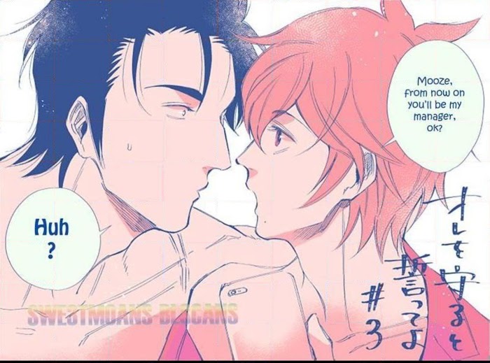 Ore wo Mamoru to Chikatteyo manga summary: "Heartthrob idol Shiina Canan accidentally helps Masaomi Mouze; a man who collapsed in front of him. Mouze in a rush of gratefulness, kneels down and requests to "Return his gratitude". When Mouze's manly body and back tattoo caught Canan's eye, he offers Mouze to live with him as his bodyguard to return the favour. A dutiful sense of gratitude X A bitch hidden behind a heartthrob facade." A dutiful sense of gratitude x A bitch hidden behind a heartthrob facade. This is a dramatic story about two people with perfect physical attraction.