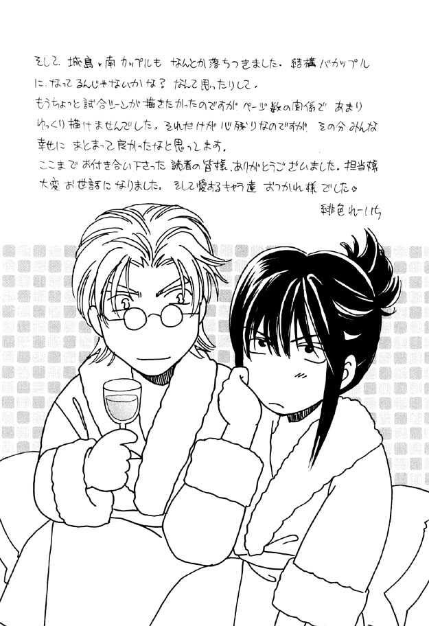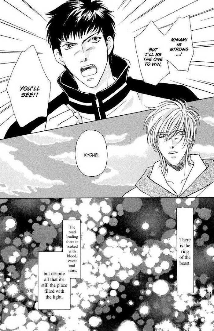 Kyouhei is a boxer, training to become world champ. He has a dark past. Yuuya is a chef, or was until Kyouhei got him so riled up he slugged him on the job and was fired. Minami *shivers happily* is this super-gorgeous boy who once trained with Kyouhei's, though they also have bad blood in the past, and are now rivals. (Source: MegKF)