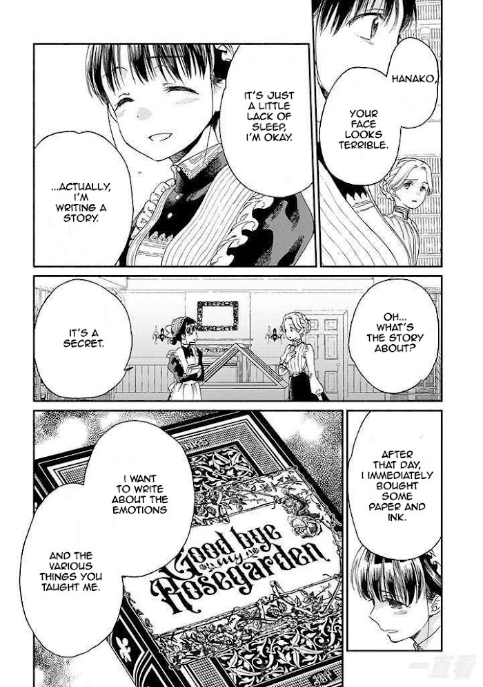 England, the early 1900s. Alice, a young noblewoman, has a Japanese maid named Hanako working in her household. The two have a fairly typical relationship…until the day Alice begs Hanako to kill her. As Hanako tries to figure out why her mistress would make such a terrible request, she and Alice grow closer until an entirely new feeling begins to blossom between them. Don't miss this poignant tale about women falling in love in historical Britain. Es: [spoiler] Esta historia cuenta las vicisitudes de una sirvienta japonesa y una joven británica: En este jardín de rosas, escribiremos sobre nuestros sentimientos secretos y ocultos. Siglo XX; Inglaterra. Kujou Hanako se dirige a Inglaterra tras su autor de ensueño, se encuentra en un país extranjero, sin nadie en quien apoyarse. Por coincidencia y tras la discusión con el jefe editorial del misterioso escritor Víctor-sensei, conoce a la joven aristócrata Alice Douglas, y empieza a servir en su residencia. Como su benefactora y por su mutuo amor por los libros (así como en retribución a Alice) Hanako se empeña en su trabajo día a día, sin olvidar su anhelo de conocer al enigmático escritor... Alice le dice que podrá volver realidad su deseo, con una condición: ¿Estará Hanako-chan dispuesta a cumplir con la impactante proposición?[/spoiler]
