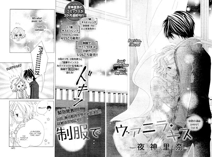 The moody, picturesque him. The puppy-like me who wants to express my love. I wonder if we can grasp this love well. (Source: Chibi Manga) Included one-shots: Volume 6: Oyasumi no Chuu wa Kuchibiru ni Shite., Spicy Boy☆, Ani ni Aisaresugite Komattemasu Bangai-hen
