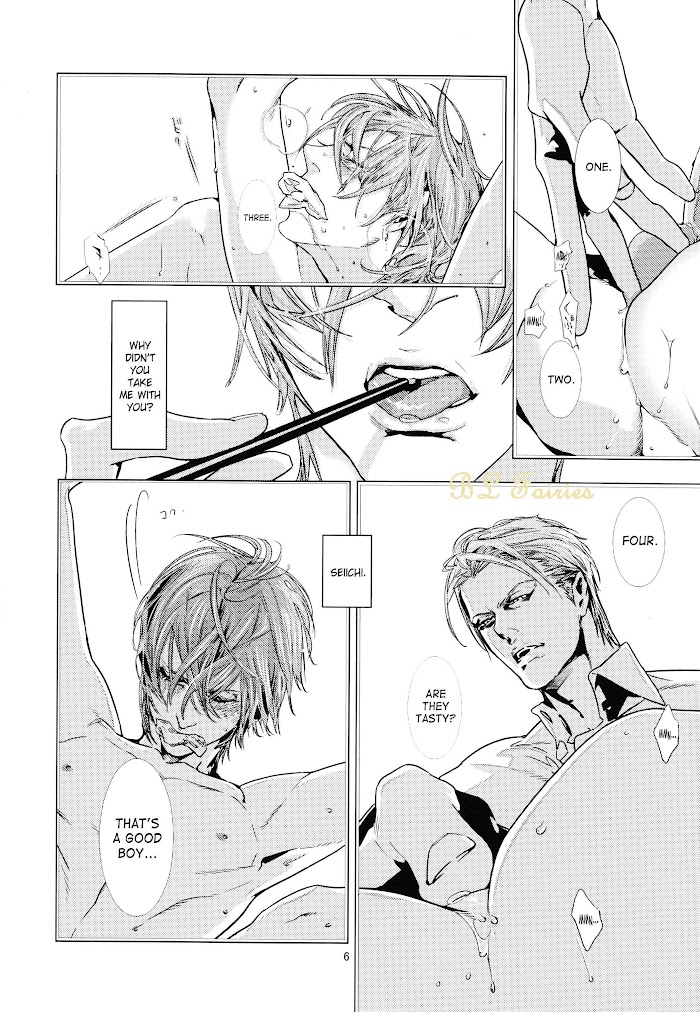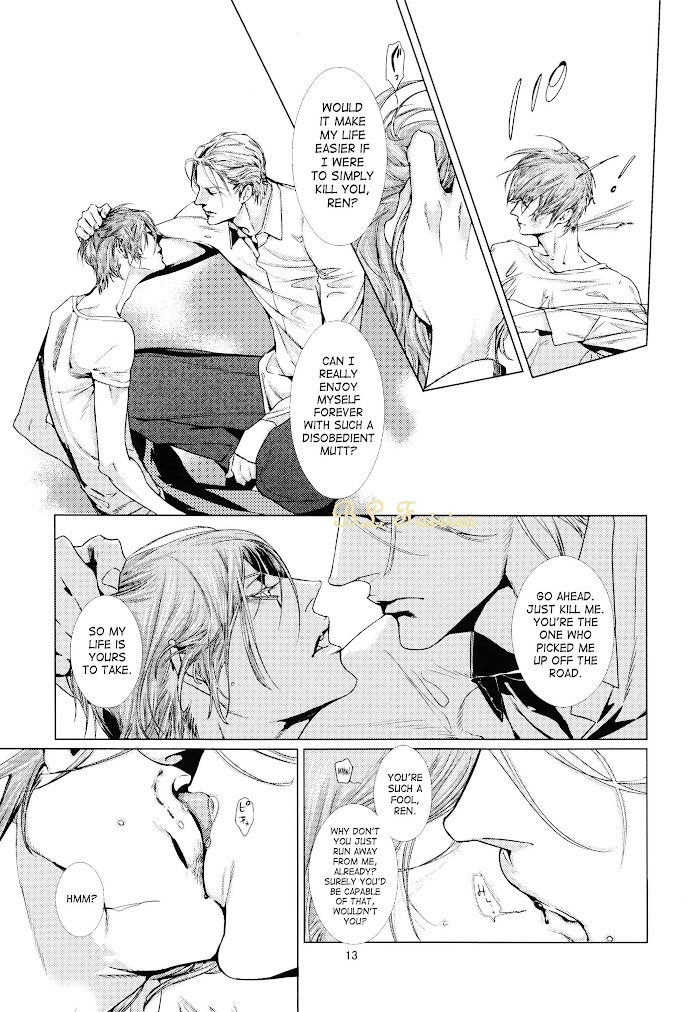 This doujinshi's based on the series of non BL novels by Shibata Yoshiki sensei. The book is called Seinaru Kuroyoru (La sainte nuit NOIRE). One of the series antagonists is Ren. This DJ talks about Ren and Seiiji's past relationship.