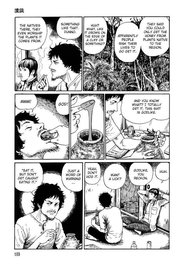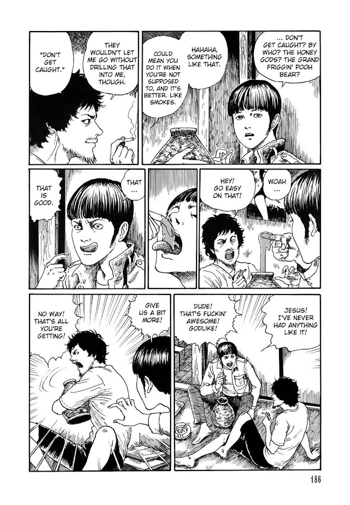 More horror stories from master Junji Ito. THE SOICHI FRONT is a direct continuation of "Secret of the Haunted Mansion" from the first Yami no Koe. SOICHI'S BELOVED PET is about Soichi, the devilish boy that Ito has written about in a number of his other stories, and the events that unfold when his family adopts an abandoned cat. IN THE VALLEY OF MIRRORS- "There is bitter enmity between two villages, facing each other across a river. But instead of erecting walls and battlements, they both decided to put up mirrors. What could this mean? And where did all the people disappear to, all those years ago?" ANYTHING BUT A GHOST- "While driving on a mountain road one night, Shigeru finds a girl covered in blood." LIBRARY OF ILLUSIONS- "Koko lives with her husband Goro in a giant mansion full of books. The books are a family heirloom, and he's fiercely protective of them, so it would really suck if something were to happen to them …" SONGS IN THE DARK- "Ever had a song stuck in your head? Of course you have, there's probably one there now. But what if it didn't go away? Days, weeks, months, the same song 24/7." SPLATTER FILM- "A bunch of stoned slackers get hooked on delicious honey, with delicious [read: grotesque] results." (Source: daniel-lau.com)