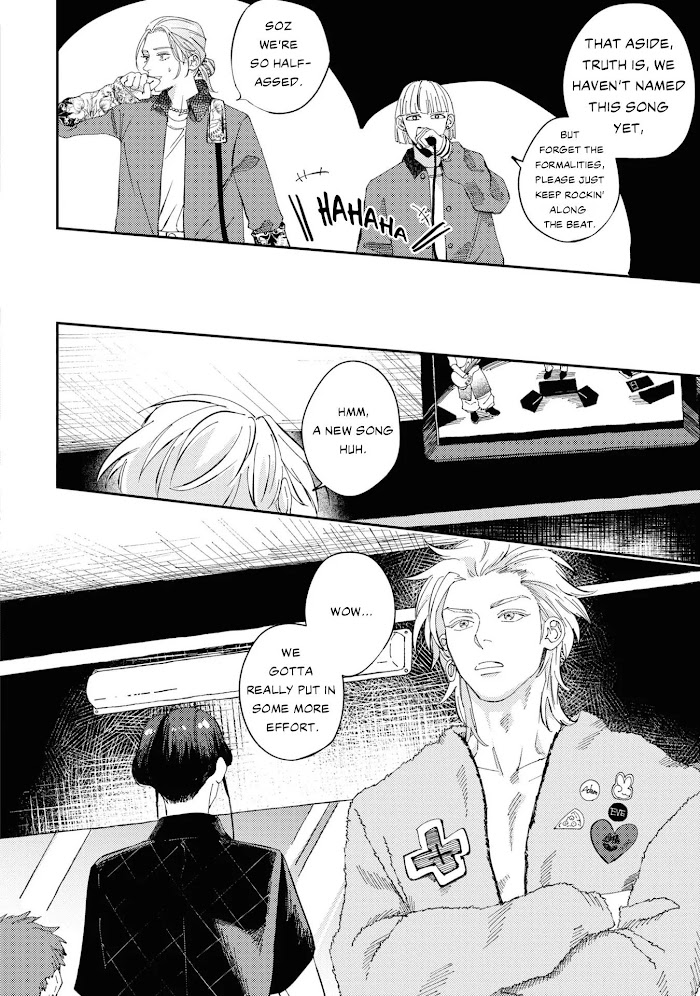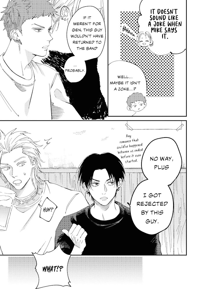 [Translated by Mosh Scans] Gen, a college student who plays the guitar in the band, “Eve”, is approached by a man at a live music venue. The moment that frivolous man who carelessly spoke to him stands on the stage, he becomes captivated by his voice. The next day, Gen finds out that he attends the same college as this man. The man, Mike, has a soothing voice, even while just talking. Gen is usually uninterested in other people but, his voice and his presence bother him, so he can’t help but to be curiou