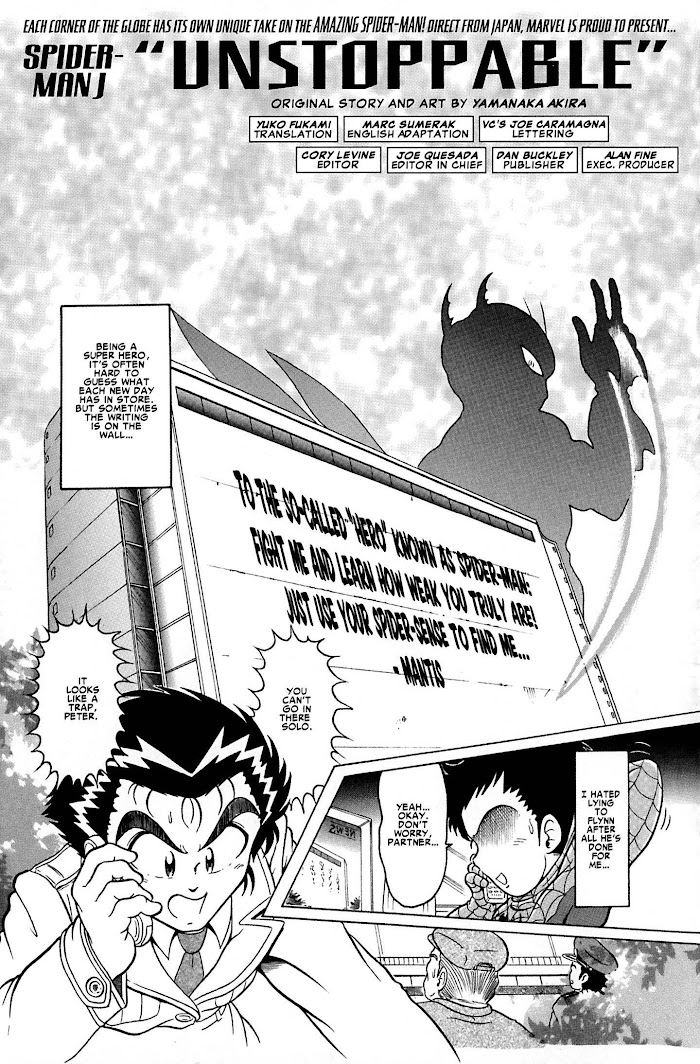 In the year 200X, a supervillain who goes by the name Lord Gokibu wants to steal the fossil of the Insect King, 15 year-old Shou Amano uses his new spider powers to become Spider-Man J, to prevent this from happening. During his time as a superhero, he meets Japanese versions of Elektra, Dr. Doom, Blade, and the Fantastic Four. (Source: Wikipedia)
