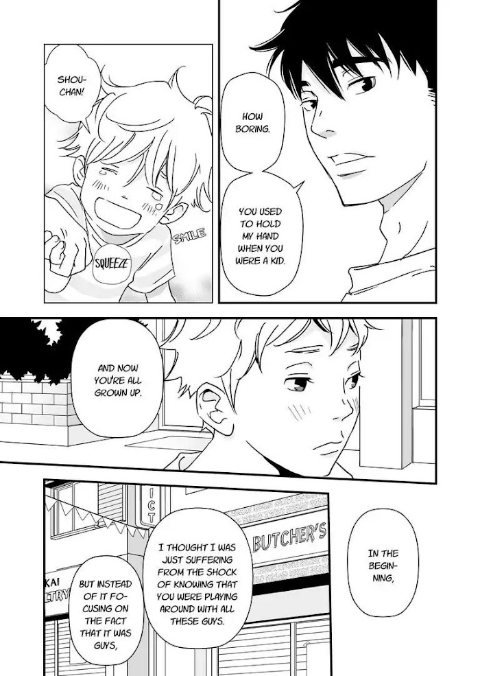 Stories from the Shopping District manga summary: After hearing about his father's hospitalization, Shouta decided to leave his Pastaio job in Italy and inherit his family Western cuisine restaurant in Hurubita Shopping District. Not much has changed in the district, except probably his-used-to-be-innocent childhood friend, Makoto, who had now bloomed into an attractive guy everyone in the district wanted to sleep with. Makoto's casual sexual relationship with many young men in the district kinda drives Shouta crazy, but maybe... Just maybe Makoto still saves some of his innocence for the guy who hadn't been home for 7 years.