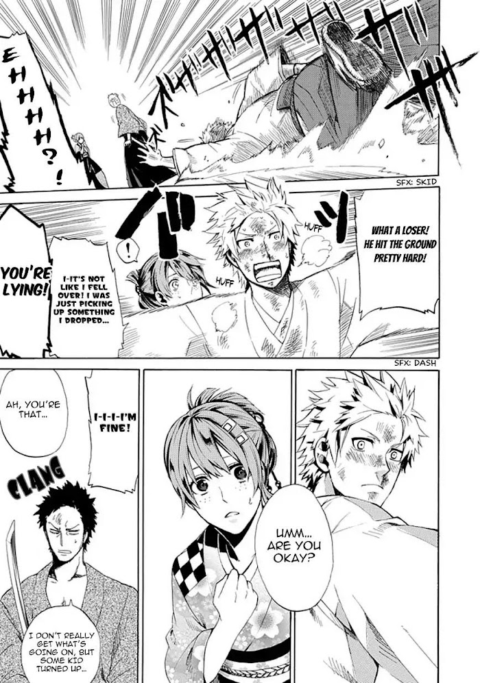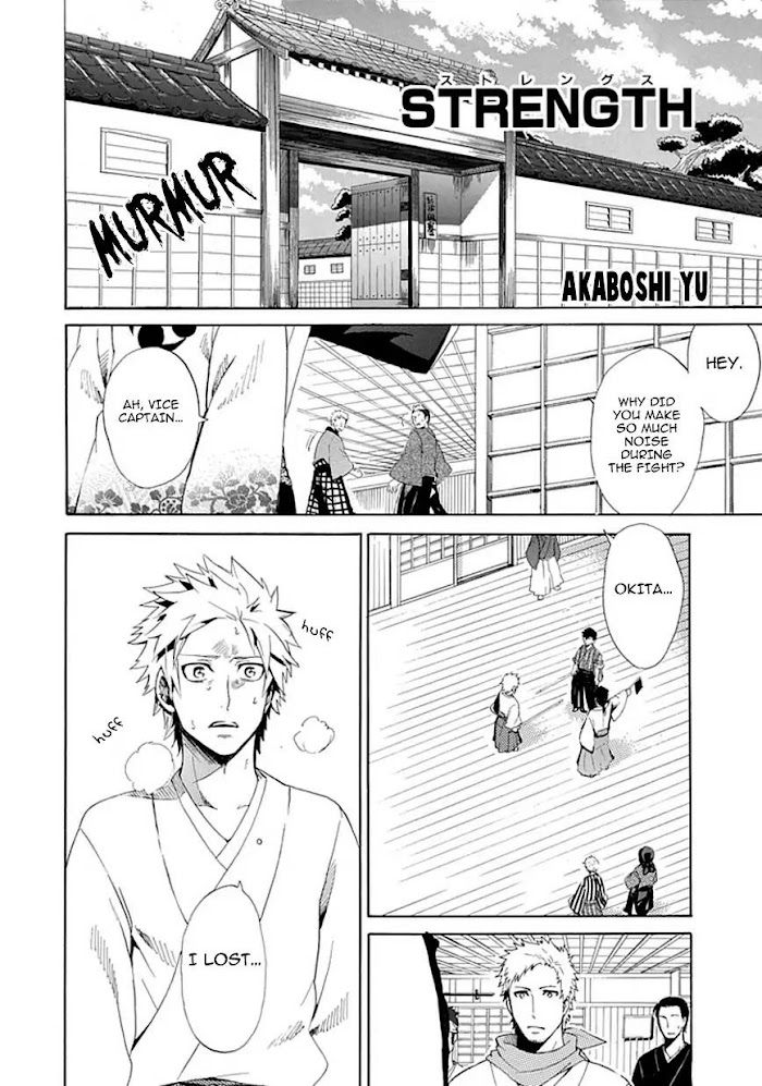 The captain of Shinsengumi's first troop has not been performing well. It's making his comrades worry, and they assume that his "condition" was because of love. Does love make one weaker? Or otherwise?