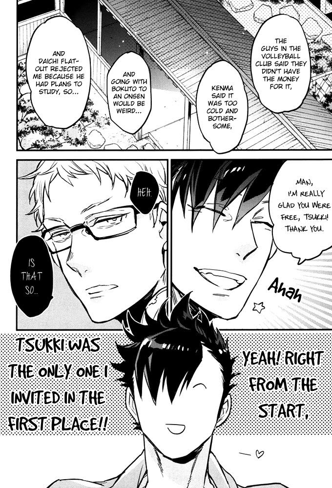Kuroo Tetsurou x Tsukishima Kei In a stroke of luck, Kuroo wins an overnight trip to an onsen. Happily, he invites Tsukishima to go with him.