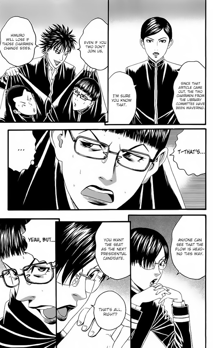 Akaba Teiichi is beginning his student career at an elite private boy's high school, which was originally renowned for producing many excellent naval officers. In its current incarnation, his school regularly turns out many important politicians and bureaucrats, and networking starts from day one. Teiichi is determined to become the school's student council president, a position which will help launch him into the political sphere after graduation. He has run his life so far by maintaining a perfect image, while never neglecting the darker side of politics. He has plenty of help to reach his goal. Teiichi's father, who is now an important bureaucrat, lost the position of student council president during his high school years, and that loss has continually hindered his career. He's determined to support his son's success in any way he can. Teiichi also has his loyal best friend and second-in-command, Koumei, helping him with strategy. On the side of emotional support, Teiichi has his little sister and mother, in addition to his girlfriend Mimiko. However, an unexpected force may rise against his ambition. An idealistic new teacher, Kurosaka Reiko, is determined to use her power to undermine the corrupt political traditions of their school. Her first step is to push a well-liked, highly intelligent, but poor student named Otaka Dan, who is not from the elite feeder middle school, into the political world. Will Teiichi be able to use the existing political system to achieve his goals, in spite of Kurosaka's efforts to upset the status quo? (Source: Raw Distro)