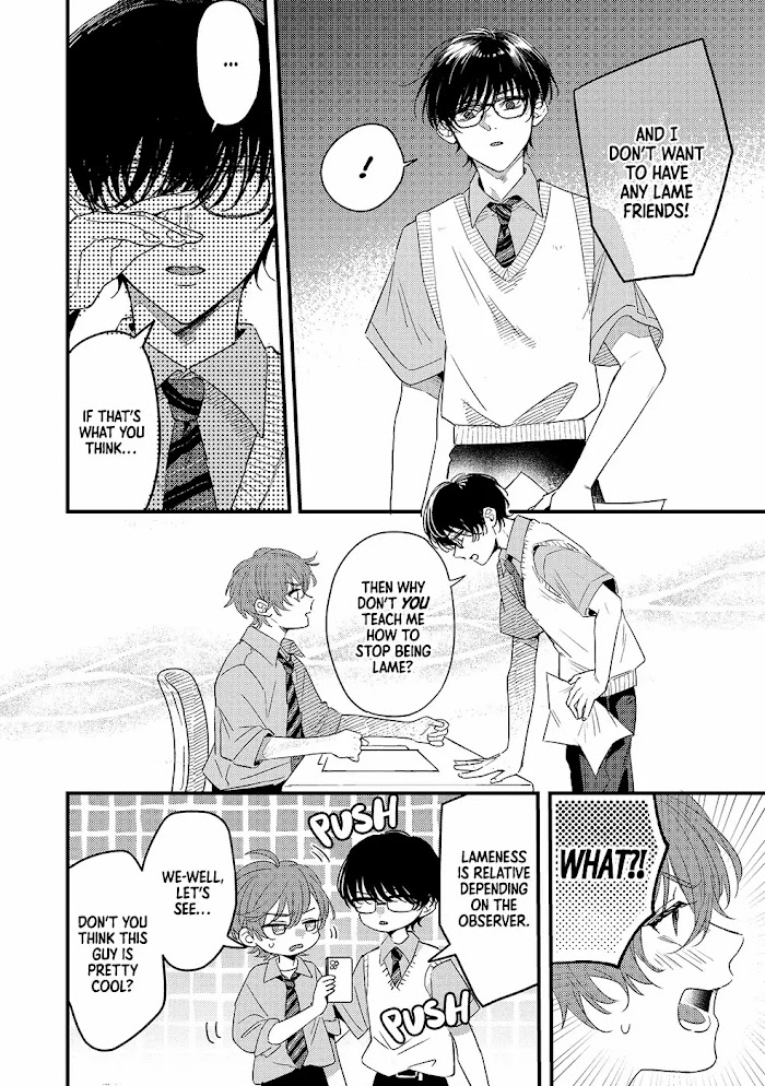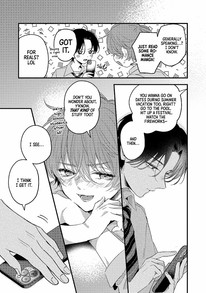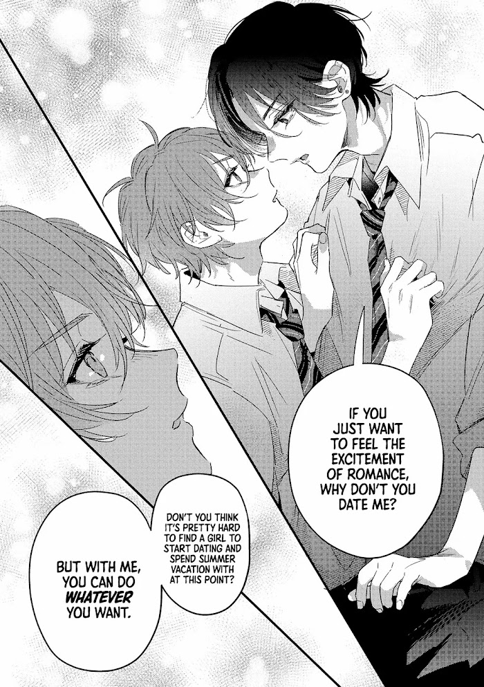 "If you just want to feel the excitement of romance, why don't you date me?" Aoi and Sora are polar opposites who, due to their bad grades, are forced to take extra lessons over summer break if they want to get into university. Despite their differences, they hit it off and quickly become friends. One day after class, Sora tells Aoi he wants to get a girlfriend and experience that fluttery, heart-racing feeling of liking someone. Aoi replies that it's a bit late to find a girlfriend to spend summer vacation with, and then suddenly asks why Sora doesn't just date him instead?!