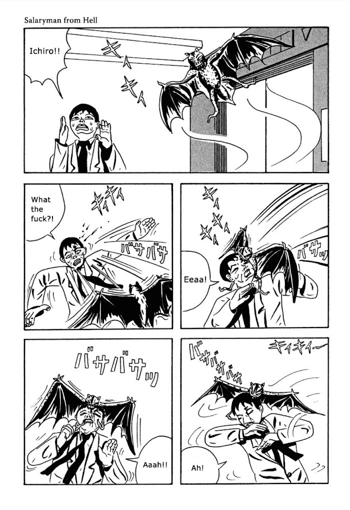 ‘Salaryman from Hell' is the first in a collection of Ebisu's stories entitled "The Man Who Saw Hell." It's about the day in the life of a normal Japanese salaryman. For the uninitiated, salarymen are an iconic figure in modern Japan, taking the role of everyman. Ebisu uses this generic salaryman figure in most of his stories. (Source: Cheap Manga)