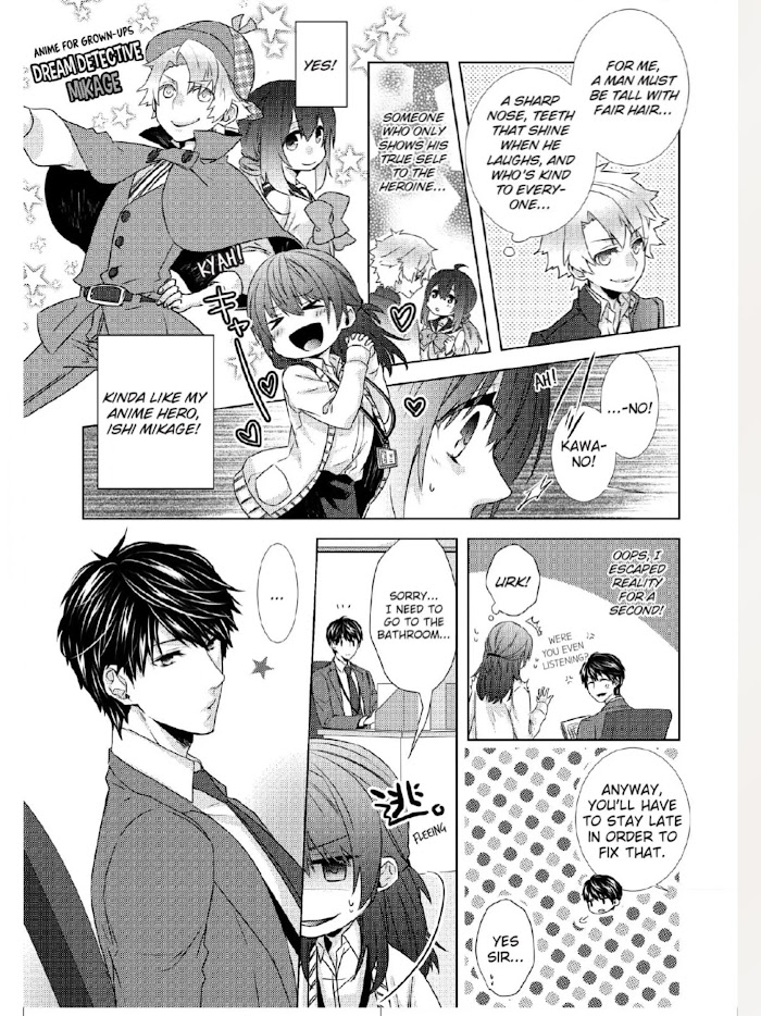 Description : In this world, it's either you have people's attention, or you don't, and Kawano's perfectly fine with being the wallflower... as long as she gets to support her anime bias, Dream Detective Ishi Mikage! She's really not interested in stuff like real-world lovers, or the reason why she saw her hot-headed boss in a very compromising position - but when this same indifference makes her boss Kunishima even more interested in her, how much longer can she stay unnoticed?