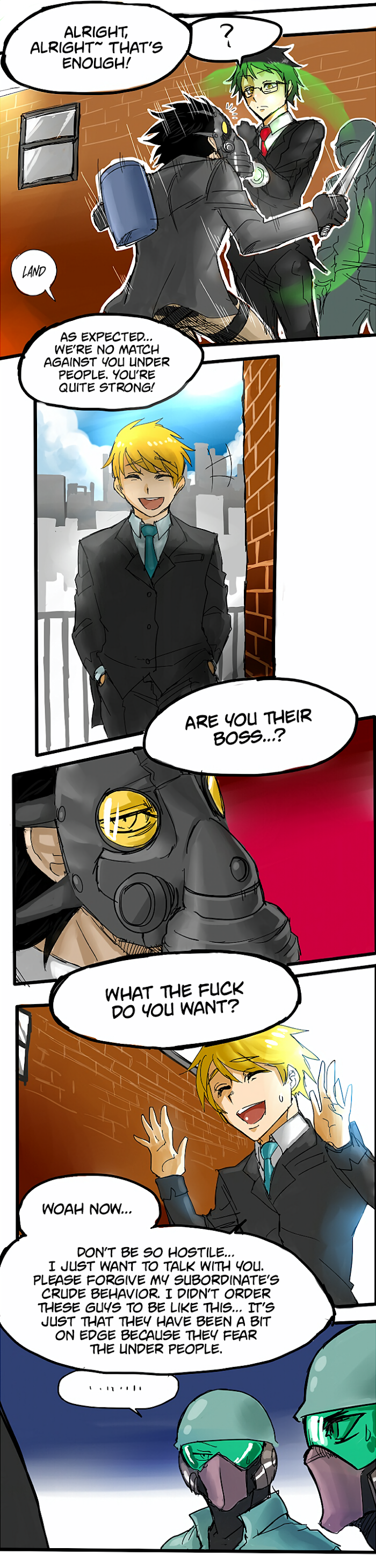Their Color manga summary: Due to the magical essence leaking out of the new dimension that opened up within this world, all living creatures started to mutate into monsters. However, the remaining survivors of the human race were able to reduce the effects caused by the magical essence, and the world became divided into two factions. The "New World", and the "Under World". Because of this, the people left behind in the Under World became adapted to their surrounding environments, and evolved into a new species. These people became known as the "Under People", and they seem to be far more superior and powerful than the human race…?