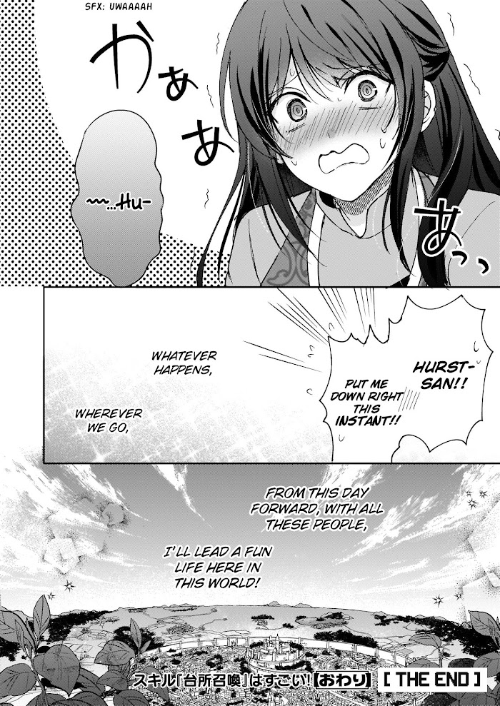 This "Summon Kitchen" Skill is Amazing! ~Amassing Points By Cooking in Another World~ manga summary: In another world, the skill I was bequeathed was――"Summon Kitchen"? Eh, what the heck is that?! The Office Lady that got mixed up in a high school girl's summons to another word―Isarai Shiina. Unlike the warm welcome given to the high school Saintess, Shiina is forced to live in a corner of the royal palace with her mysterious and newly obtained "Summon Kitchen" skill. Apparently, using the skill to cook food amasses points, which can then be used to evolve the "kitchen". 'With nothing better to do, and things being what they are, I might as well work towards getting my glorious dream kitchen!' but, despite her enthusiasm, Shiina was told to keep the contents of her skill a secret by her guardian knight, Hurst...
