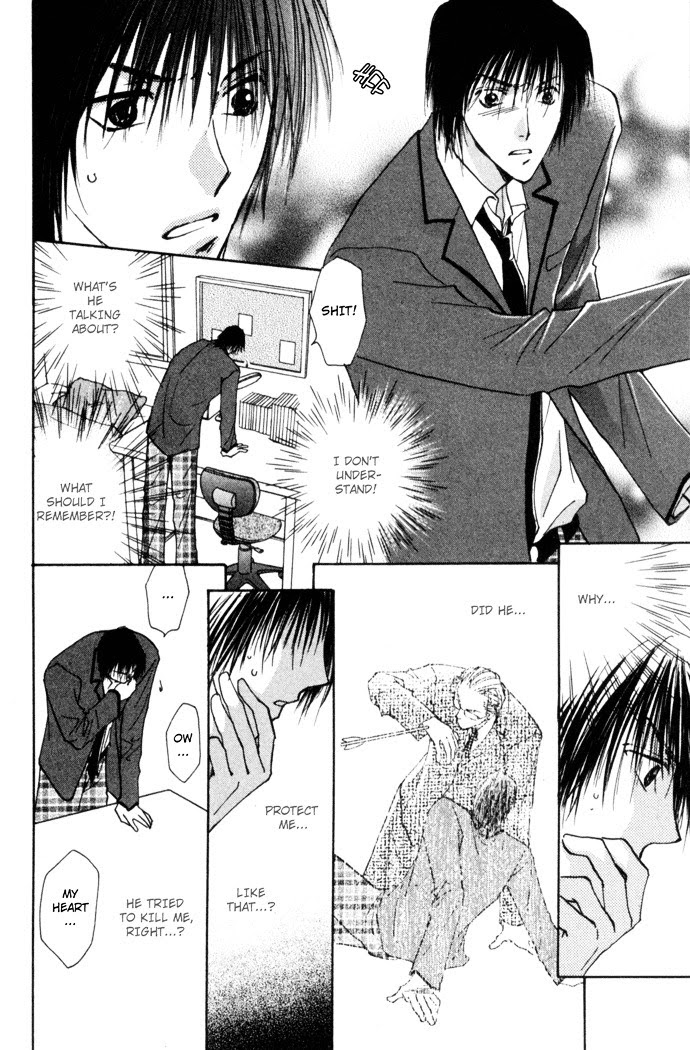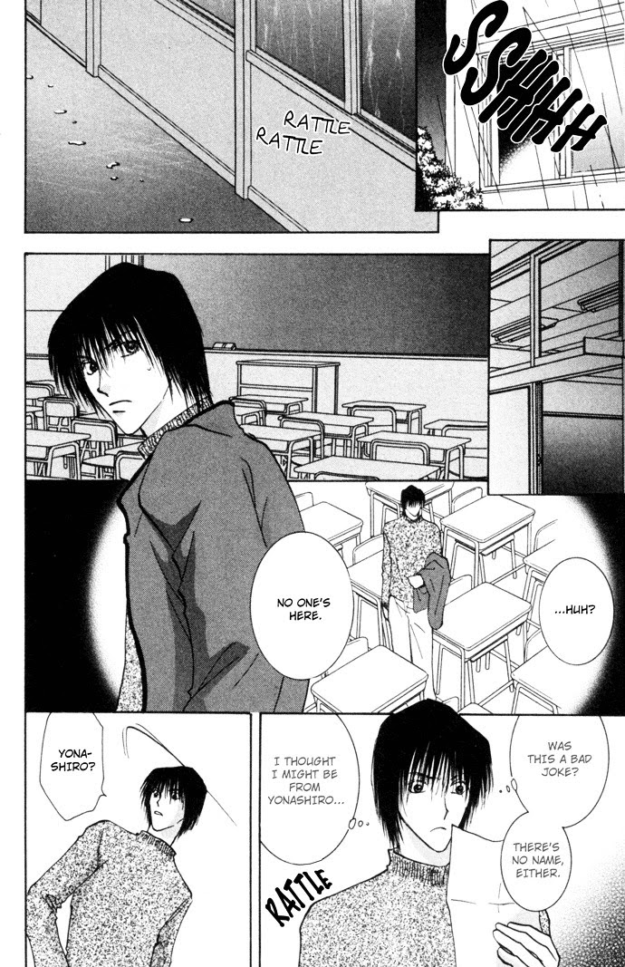 This volume contains three short stories. Chapter one, the title story, is about Noda, a boy who has 3 secrets: First, he's in love with his classmate Fukushima. Second, he can draw his spirit out from his body. And finally, sometimes he secretly watches Fukushima at home, when his spirit has left his body. But one day he drops in at Fukushima's at a very unfavorable moment. Chapter two, Beside, is about a boy who is asked to take care of a huge white rabbit and how the animal makes him understand his own feelings. Chapter three is about Yuzuru Sakaguchi, a boy who leads a lonely but peaceful life, cut off by the rumor that you can see ghosts around him. One day a new teacher comes to his school and his life is thrown completely out of joint. (from B-U)