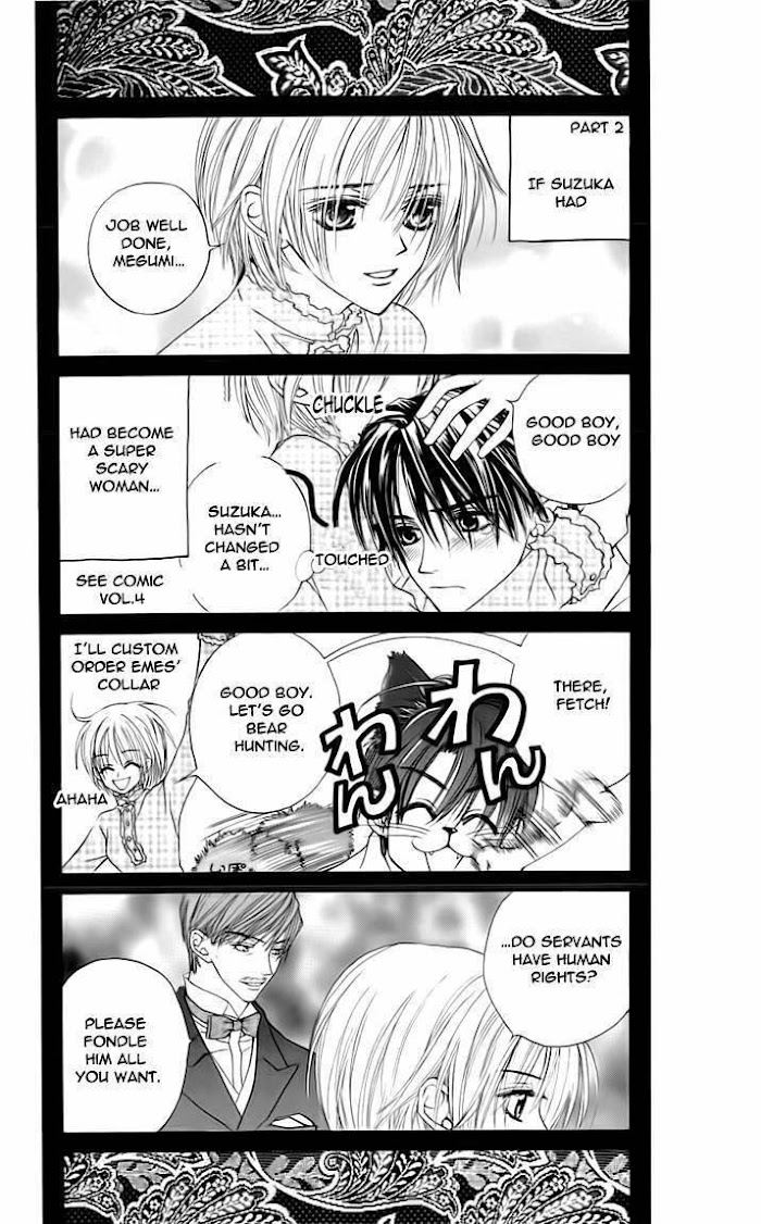 Megumi is a descendant of Kuronekomaru, a famous thief who stole an heirloom from a samurai's mansion. When he opened the scroll, the family's guardian dragon appeared and cursed Kuronekomaru and his descendants: his family is destined to serve Kougami's family for one hundred generations. Megumi is living the high life, since the last of the Kougamis vanished two years ago. However, when Suzuka-the current generation of the Kougamis-returns home, Megumi has built up no resistance to the curse, so he is forced to serve her with a slave-like obedience. (Source: ANN) Included one-shots: Volume 1: Real no Arashi (Real Storm), Jikan wo Kourasete (Let the Time Freeze) Volume 3: Pere Noel no Nagai Yoru (The Long Night of Pere Noel) Volume 5: Kiss no Hontou no Imi wo Oshiete (Tell Me the Real Meaning of That Kiss)