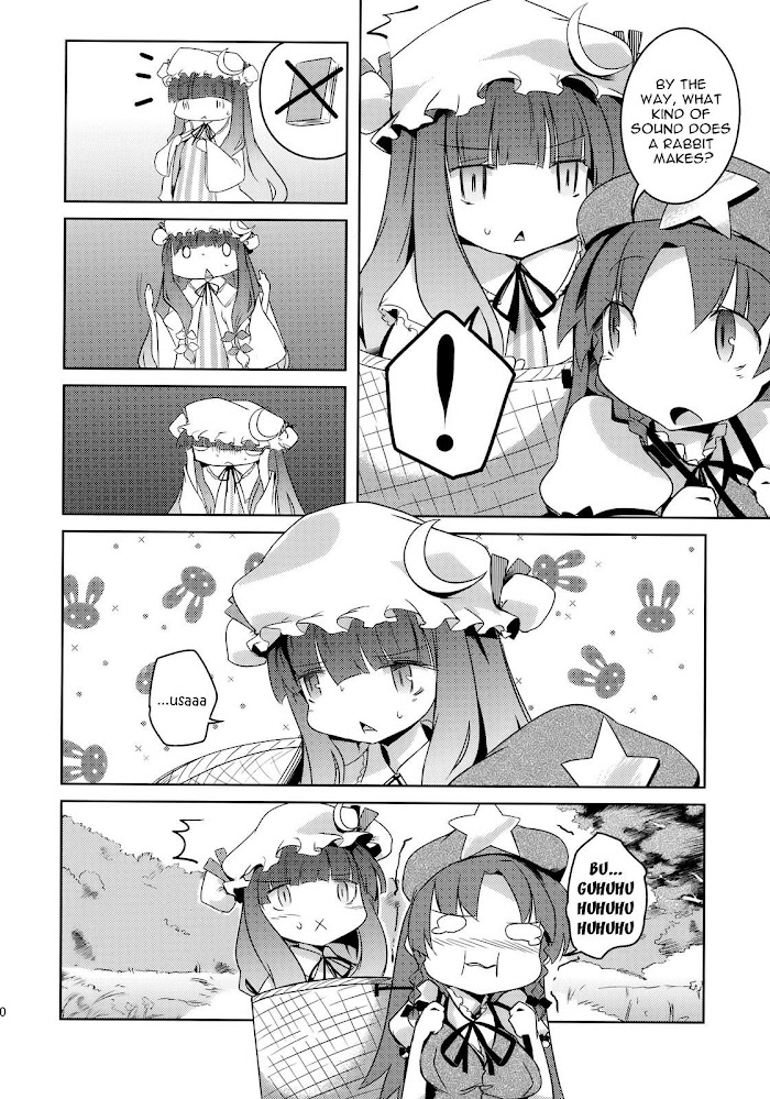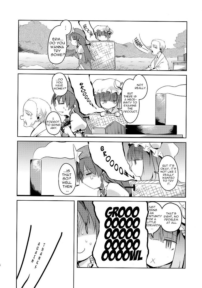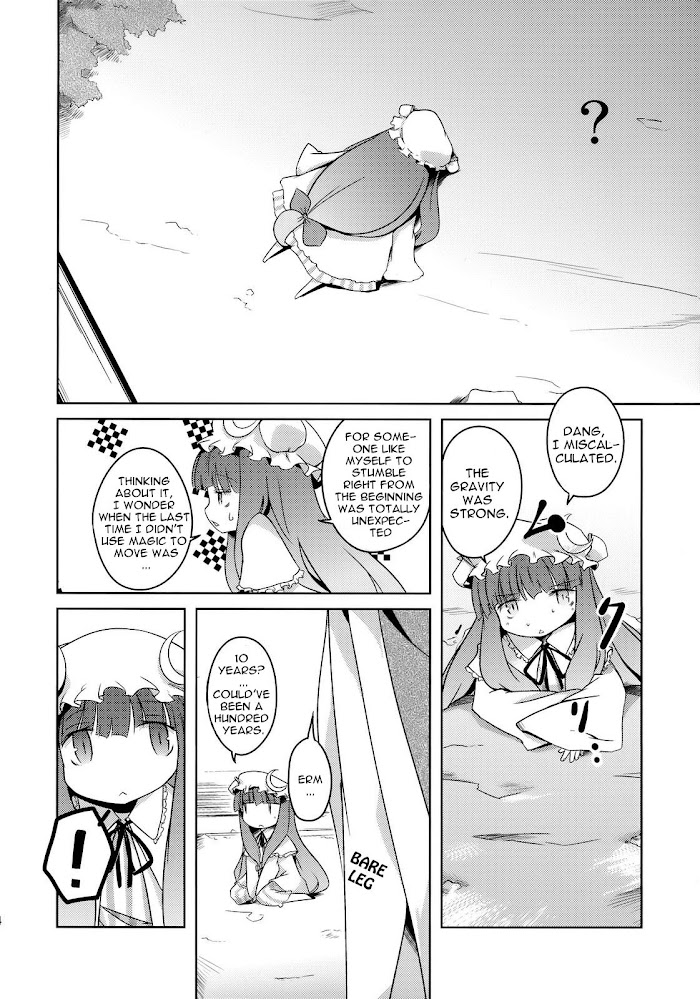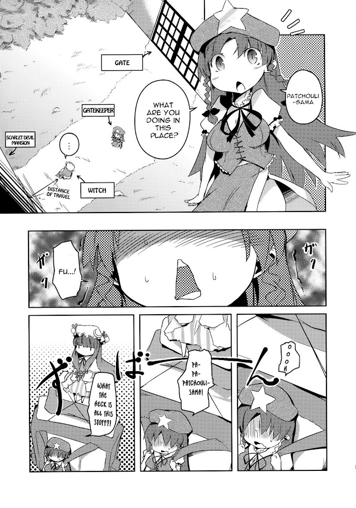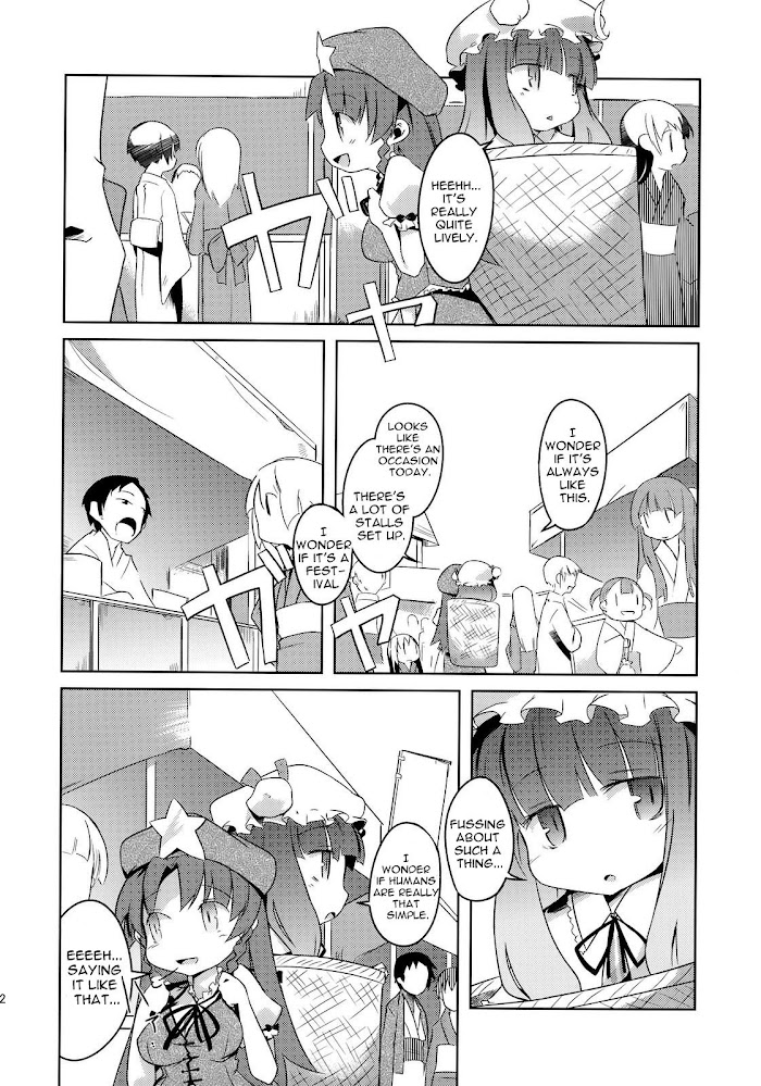 Patchouli decides to go without magic for a day, and visit the human village on foot while at that. But not necessarily by her feet, mind you.