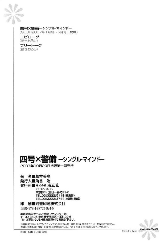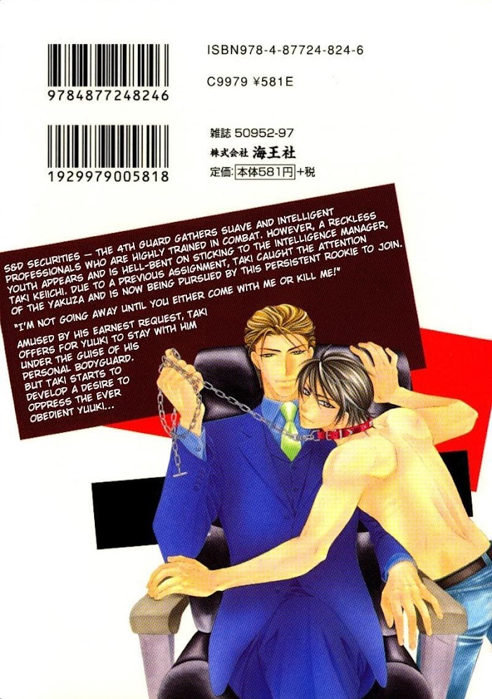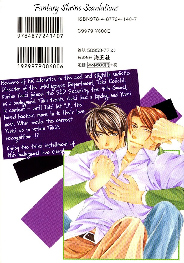 Yongou x Keibi - Single Mind manga summary: From Fantasyshrine: V.01 - Single Mind S&D Securities -- the 4th Guard gathers suave and intelligent professionals who are highly trained in combat. However, a reckless youth appears and is hell-bent on sticking to the intelligence manager, Taki Keiichi. Due to a previous assignment, Taki caught the attention of the yakuza and is now being pursued by this persistent rookie to join. "I'm not going away until you either come with me or kill me!" Amused by his earnest request, Taki offers for Yuuki to stay with him under the guise of his personal bodyguard. But Taki starts to develop a desire to oppress the ever obedient Yuuki... V.02 - Second Wind Kogami Shinobu is the number-one cool beauty of the Intelligence Department in the S&D Securities- the Fourth Guard, where suave and intelligent specialists gather in abundance. However, he doesn't seem to care for his partner, the laidback bodyguard Miharu "Shin" Shinnosuke's pursuit. Why is it that Kogami stubbornly refuses to mix business with pleasure, as if he's scared of it? Then suddenly, Shin seems to have shifted his attention to the new charge he's supposed to be protecting! What in the world will happen to their partnership--!? V.03 - Third Party V.04 - Four Card(s) V.05 - Five Minutes V.06 - Zero Hour V.07 - Sixth Sigma V.08 - Seventh Heaven V.09 - Eight Knot(s) V.10 - Nine Lives V.11 - Ten Gong