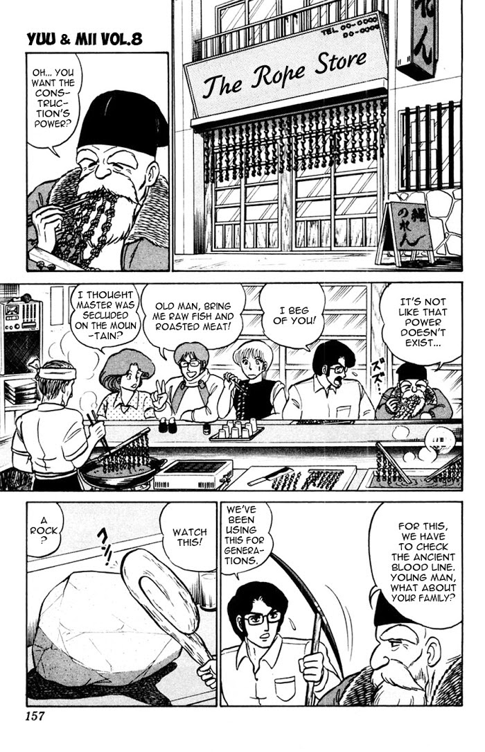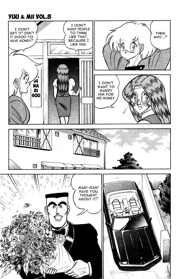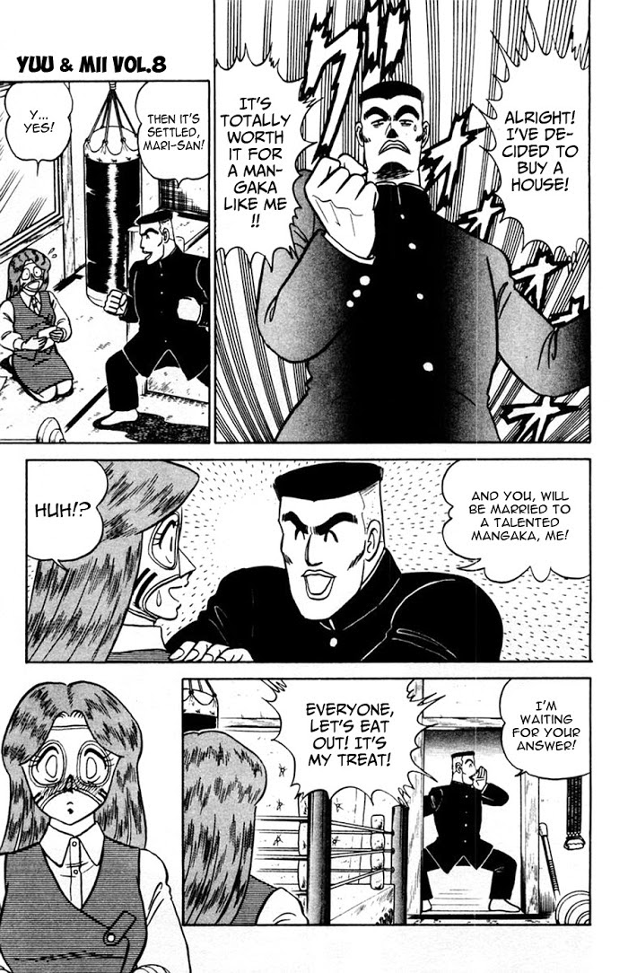 The title "Yuu & Mii" is a pun on the English phrase "You and Me". Aimu Yuu (remark: his name sounds like "I'm you") is a boy who just moved into the equivalent of a boarding house. Everything is not as it first seems, even the boy. Living in the same room is a ghost named Mii. The series is a combination of love, humour, and a general parody of anime and manga. There are a lot of weird characters in this manga. (Source: MU)